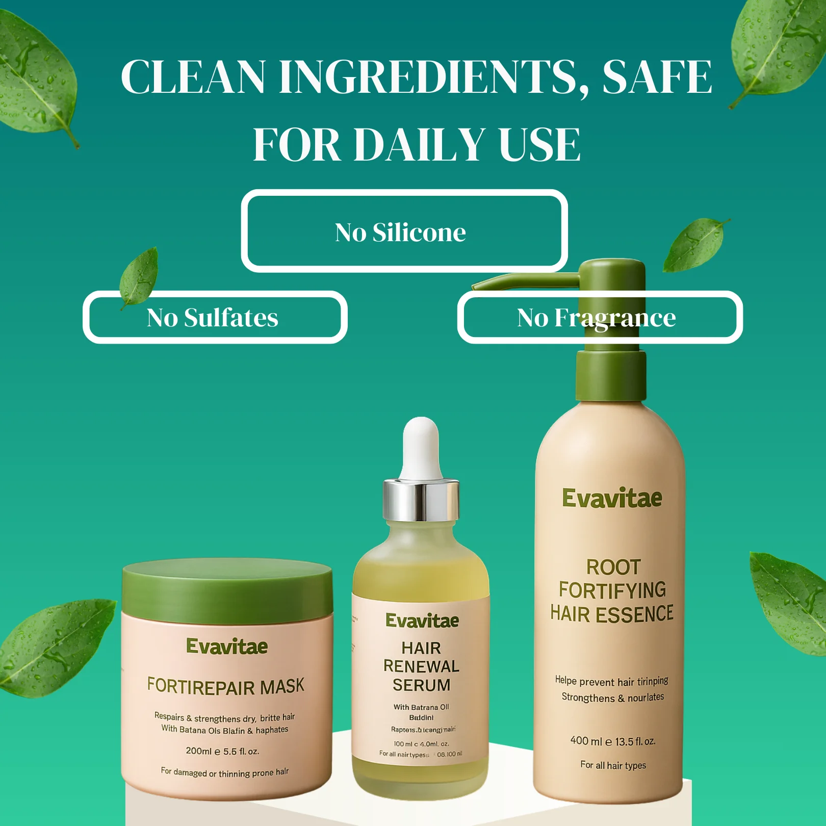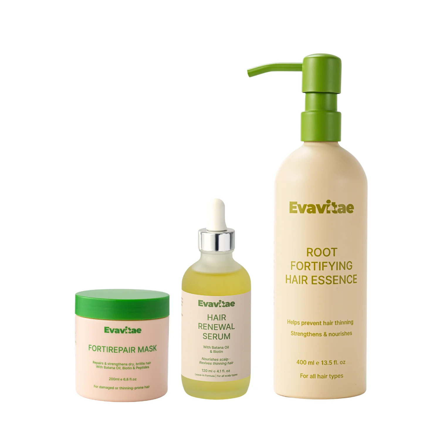 Discover the Evavitae Complete Hair Care Set – includes Hair Renewal Serum, Root Fortifying Hair Essence, and FortiRepair Mask. Restore, strengthen, and protect your hair with science-backed, sensitive-skin-safe formulas. Now available at $298.