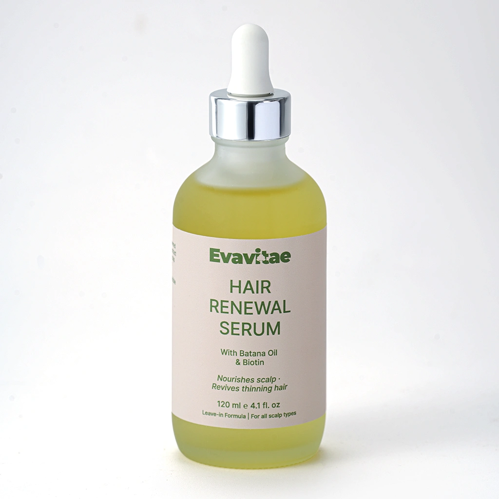 Evavitae Hair Renewal Serum is a gentle hair growth serum for women that strengthens roots and supports visible regrowth. Natural oil-based and suitable for men, it nourishes the scalp and helps hair look fuller and healthier.